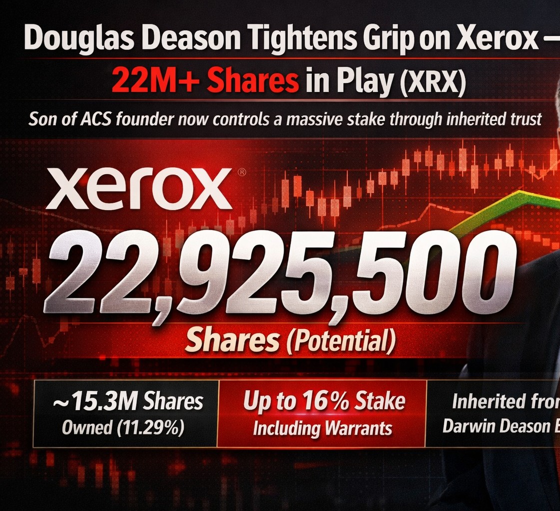 Douglas R. Deason, son of the late ACS founder Darwin Deason, has disclosed his substantial Xerox stock insider ownership through the DD Revocable Trust, which he now controls following his father’s passing. According to a recent Form 3 filing with the SEC, the trust holds 8.5 million shares of common stock, convertible preferred stock equal to 6.7 million common shares, and warrants for 7.6 million additional shares, giving Deason the potential to control over 22.9 million shares of Xerox stock. This disclosure of Douglas Deason holdings offers investors insight into insider stakes and highlights the potential influence of a major shareholder on Xerox’s corporate governance and strategic decisions.