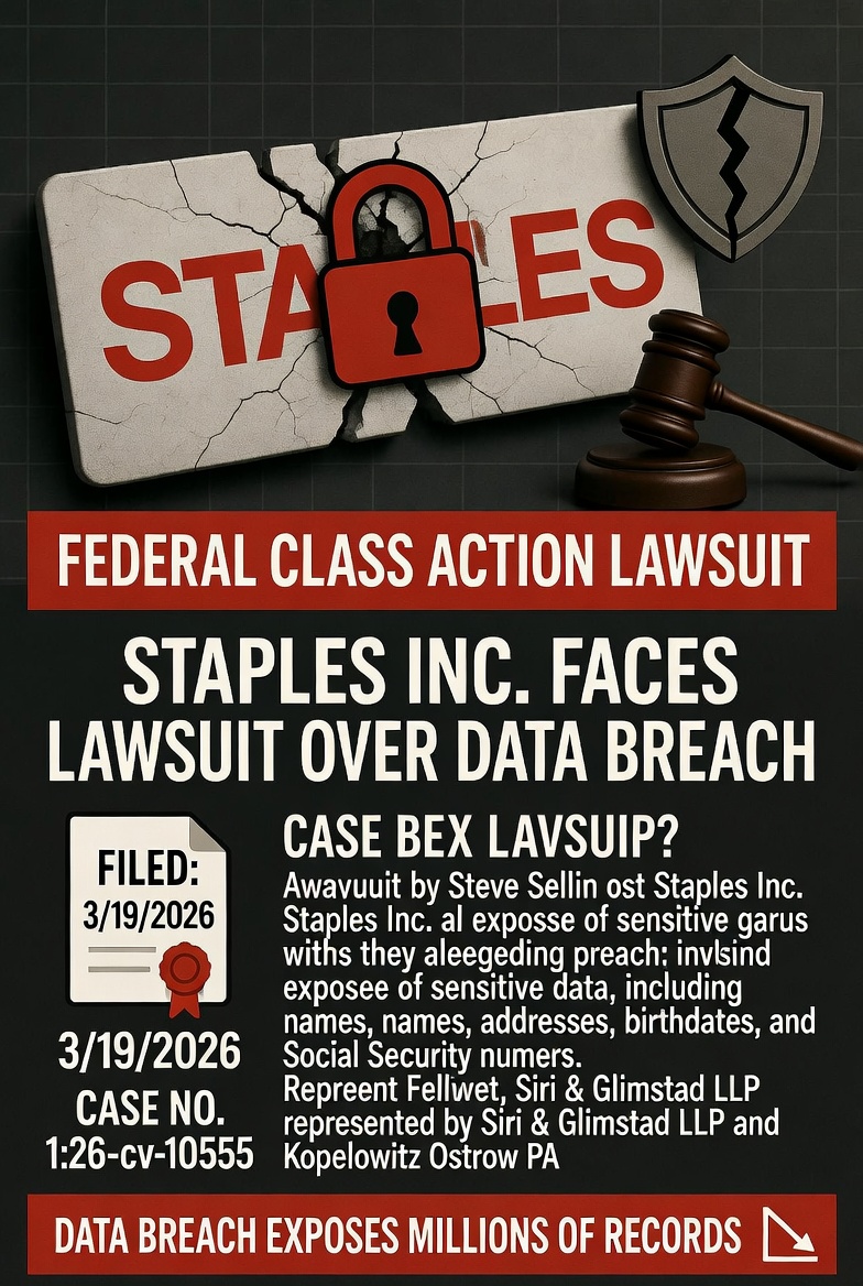 Staples Inc. is facing a federal lawsuit after a ransomware attack by the group CoinbaseCartel exposed sensitive personal data, including names, addresses, birthdates, and Social Security numbers. The suit, filed on March 19, 2026, in the U.S. District Court for the District of Massachusetts, alleges that Staples failed to adequately protect personally identifiable information (PII) it collected. Former employee Steve Sellin claims the company was negligent in implementing proper cybersecurity measures, such as data encryption and multifactor authentication. The ransomware group, which publicly posted an extortion notice on March 11, demands ransom negotiations, threatening to leak over two terabytes of stolen data. Sellin, represented by Siri & Glimstad LLP and Kopelowitz Ostrow PA, seeks to represent a nationwide class of affected individuals, demanding damages and changes to Staples’ data security practices. The lawsuit accuses Staples of neglecting its duty to notify victims and protect against foreseeable cyber threats, with claims for negligence and unjust enrichment.